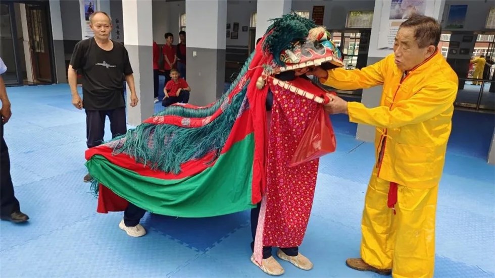 全國(guó)各地的獅舞形態(tài)不同,具有地域特色。一般分南獅、北獅兩大類(lèi),南獅矯健兇猛,多表演高難技巧;北獅嬌憨可愛(ài),多以嬉戲玩耍為表演內(nèi)容。桃州鎮(zhèn)和平青獅就是北獅傳承,在和平青獅墩一帶歷史悠久,相傳于1856年(咸豐六年)隨河南移民帶到這里,并在和平村代代相傳,據(jù)考證已有五代傳承?,F(xiàn)在的青皮獅舞第四代傳人早已年過(guò)半百,他們已經(jīng)培養(yǎng)了第五代傳人。今天來(lái)給同學(xué)們展示的就是第四代傳人李芳全、李芳喜。