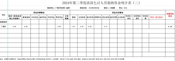 名稱: 2024年第二季度廣德市流浪乞討人員救助資金統(tǒng)計表 文號: