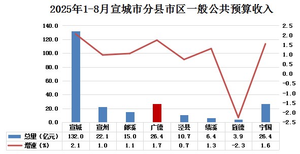 4.財政。1-8月,全市實現(xiàn)一般公共預算收入26.4億元,同比增長1.7%,8月當月實現(xiàn)一般公共預算收入2.6億元,當月同比增長10.8%;稅收收入累計完成18.7億元,占一般公共預算收入比重為70.7%。