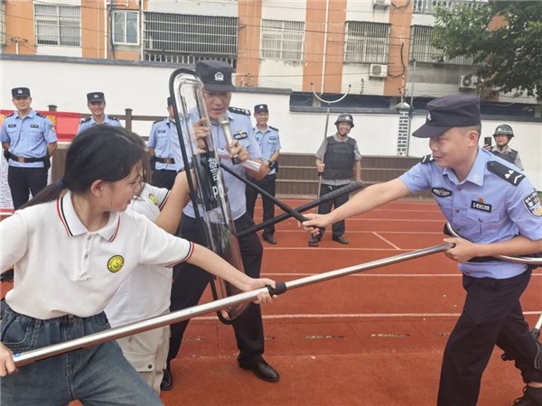 活動(dòng)中,法治副校長(zhǎng)重點(diǎn)圍繞防溺水知識(shí)與防衛(wèi)器械使用展開講解。現(xiàn)場(chǎng)詳細(xì)演示了救生圈的正確使用方法和救生衣的規(guī)范穿著步驟,并介紹了防暴盾牌、防暴鋼叉、橡膠棍等器械的功能與操作要領(lǐng)。