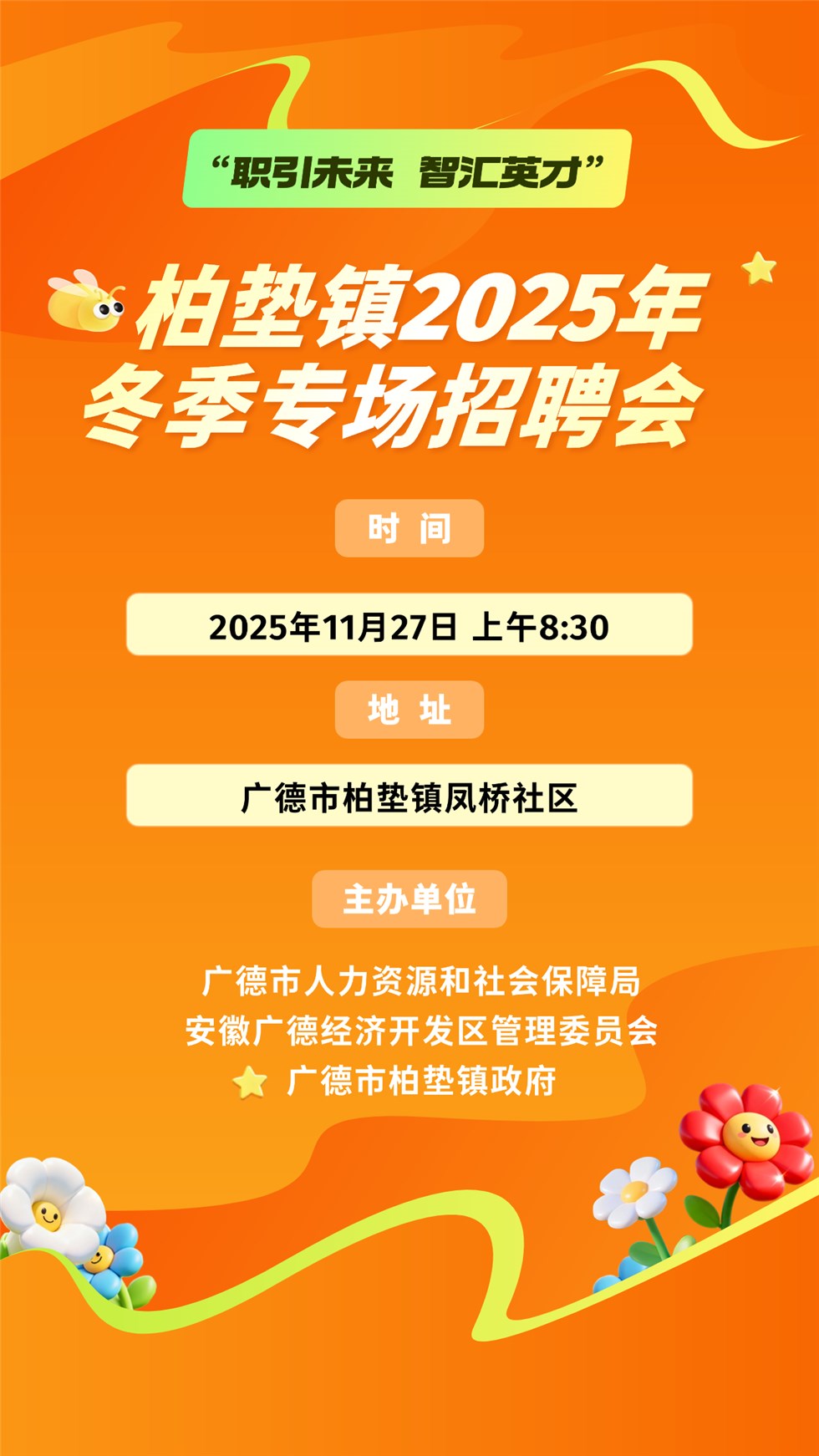 | 名稱: | 職引未來·智匯英才——柏墊鎮(zhèn)2025年冬季專場(chǎng)招聘會(huì)職等你來 | 文號(hào): | 無 |