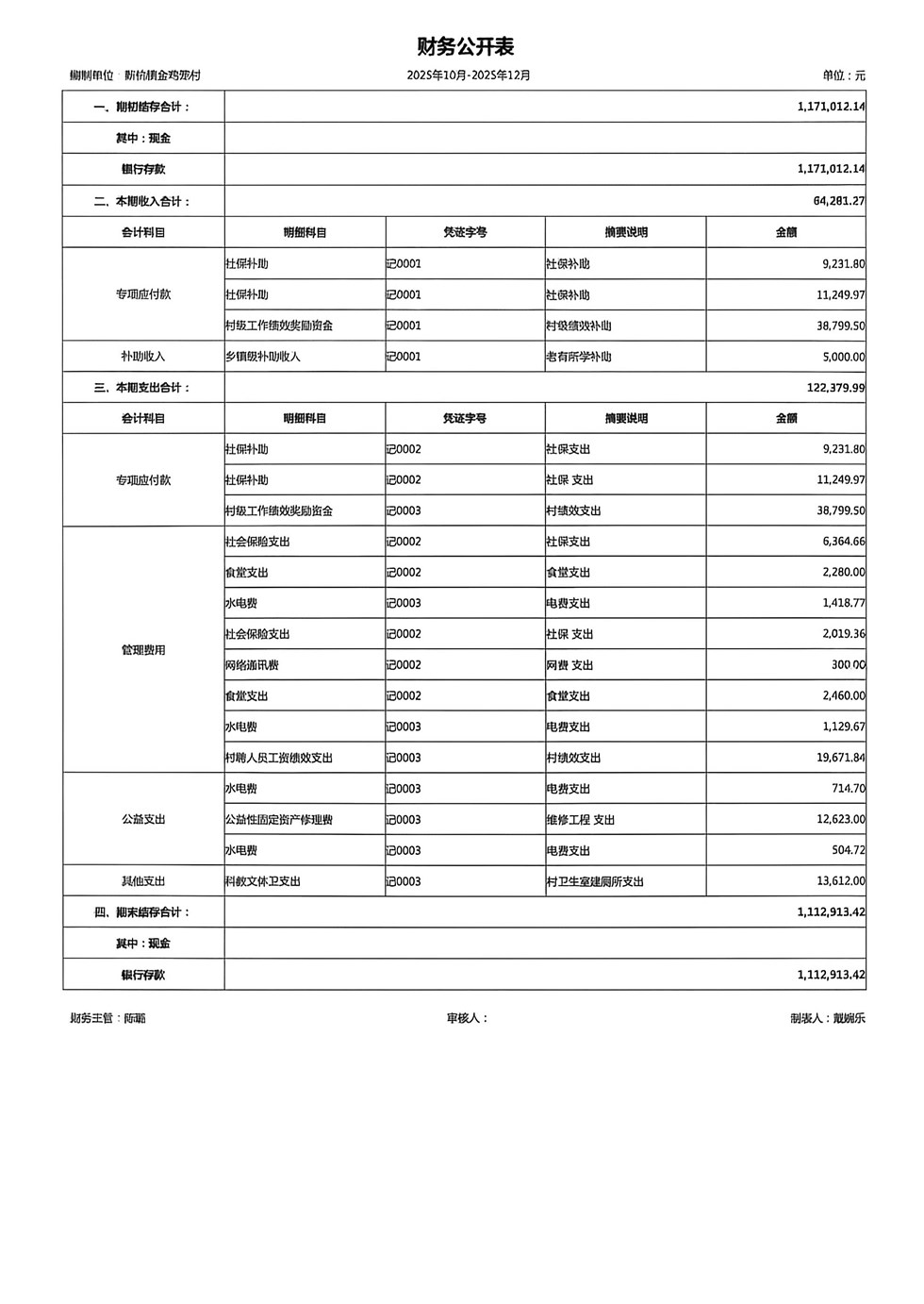 名稱: 新杭鎮(zhèn)金雞籠村2025年四季度財務收支明細 文號: